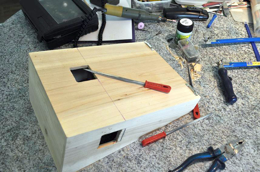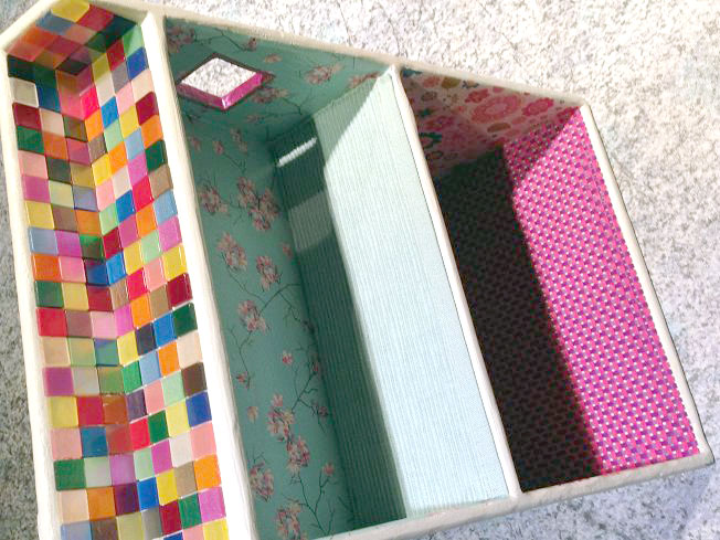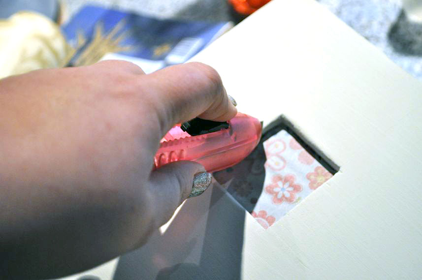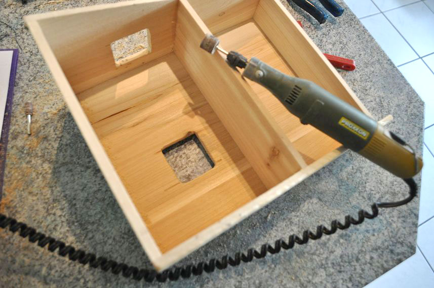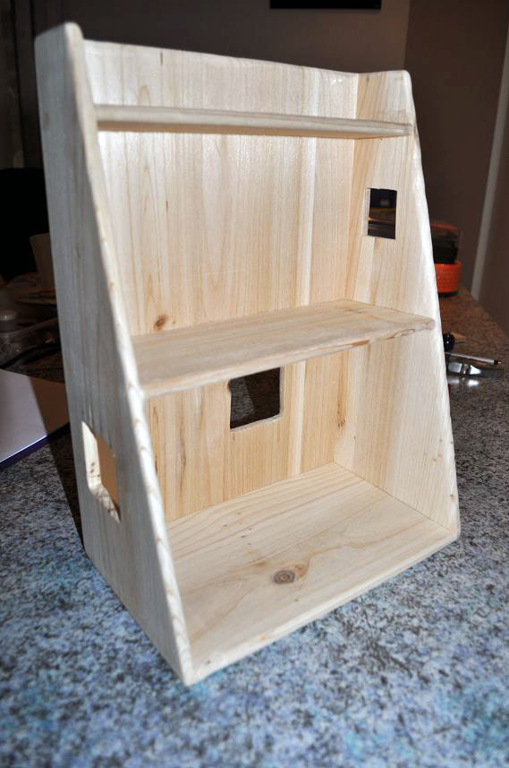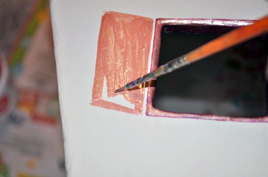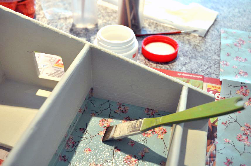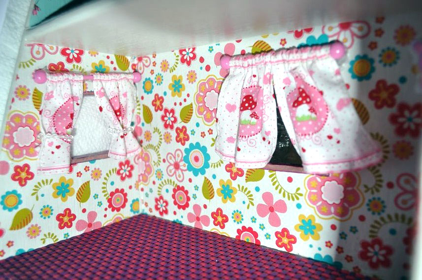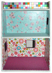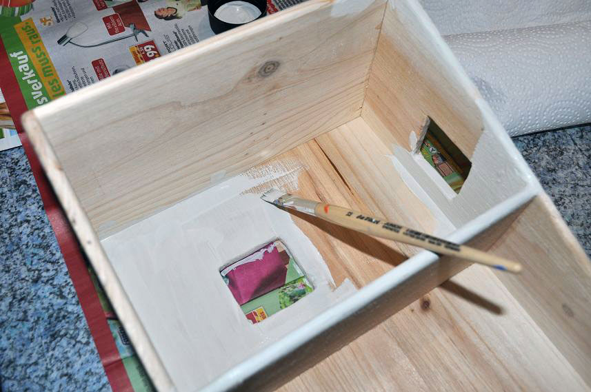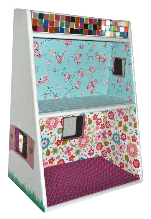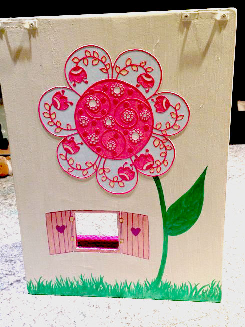Das Basishaus habe ich im Kreativbedarf gekauft. Es ist aus Sperrholz. So habe ich zunächst Fenster reingesägt. Anschließend habe ich das Holz mit weißer Farbe grundiert. Als die Farbe getrocket war, wurde innen mit Paper Potch tapeziert. Von daußen habe ich dann Gras und Blümchen mit Acrylfarbe gemalt, ebenso die Fenster, die Haustür und die Fensterläden.
