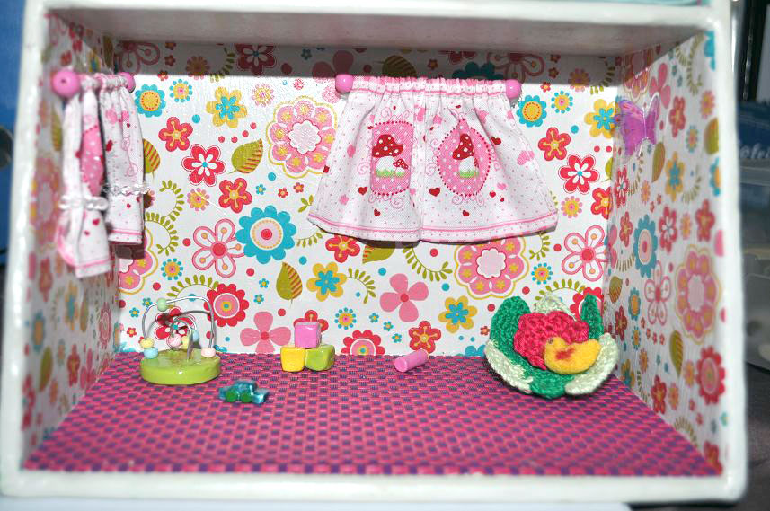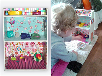 Für meine kleine Nichte habe ich ein Kinderhaus für die Sylvanians Lieblingstierchen gebaut, das sehr gut ankam ;-). Noch ist Rollenspiel nicht so ein Thema bei ihr, deswegen war es wichtig, dass es noch kein Haus für alle Tiere ist, sondern nur für die Kinder, die dann die Dinge einzeln ausprobieren (ins Bettchen gehen, in den Laufstall stellen, usw.).