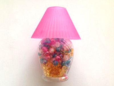 Anschließend habe ich hübsche Perlen reingefüllt und den Verschluß mit Tesa verklebt, damit nichts herauskullern kann. Nun nur noch den Deckel bzw. den Lampenschirm draufgeschraubt und fertig ist die Wohnzimmerlampe.