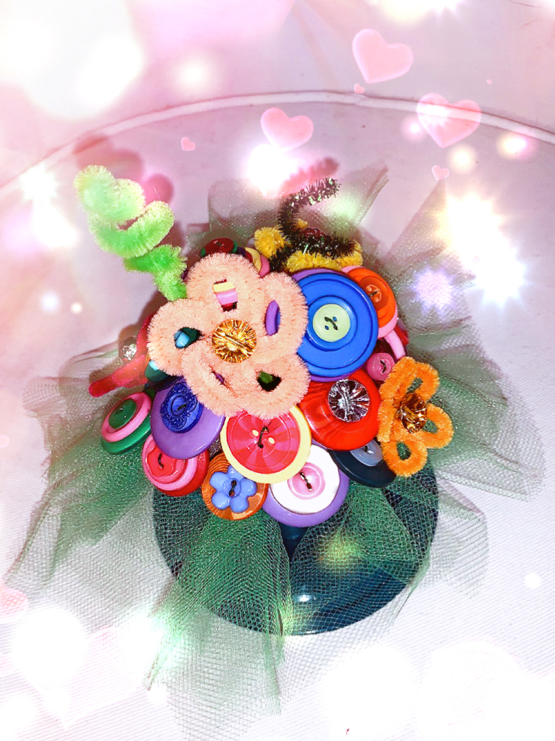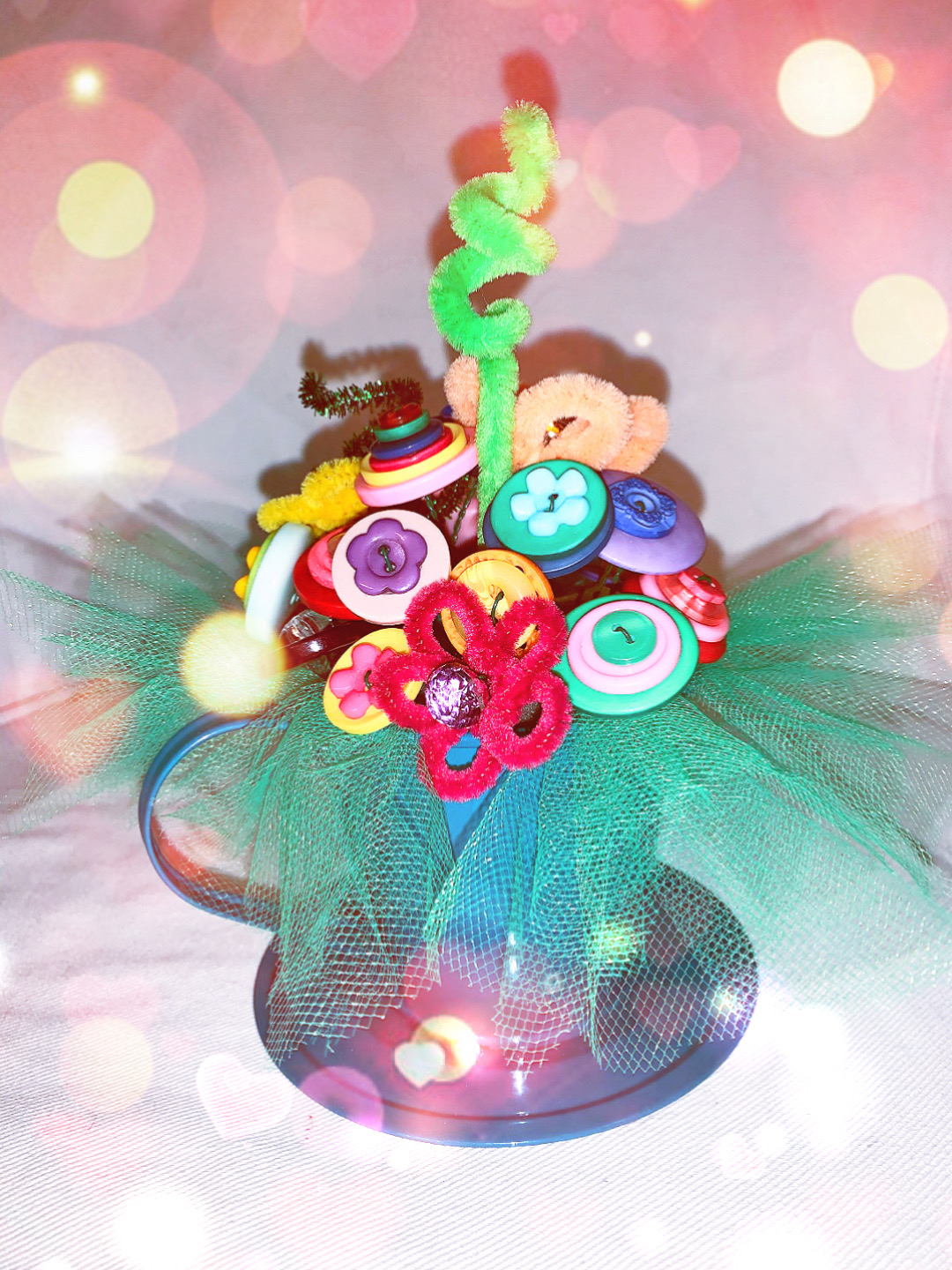 Für eine Freundin habe ich einen kleinen Knopfblumenstrauss gebastelt. Dazu habe ich einen Blumentopf gefunden, der wie eine Tasse aussieht. Mit Tüll habe ich Blätter simuliert. Weiterhin habe ich Pfeifenputzer gebogen und damit dekoriert. Die Knöpfe habe ich mit Blumendraht verbunden und unter den Knöpfen gedreht zum Stiel. In dem Blumentopf werden die Stiele dann in Blumensteck gesteckt bis sie einen hübschen Blumenstrauss ergeben.